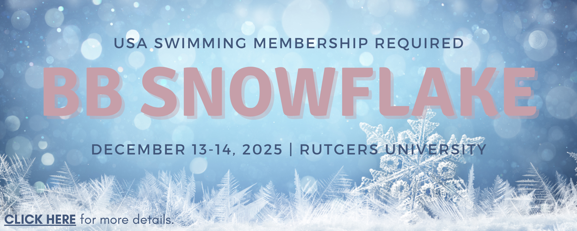 The BB Snowflake Meet will be held December 13-14, 2025 @ the Sonny Werblin Recreation Center @ Rutgers University. USA Swimming membership is required to attend. CLICK HERE for more information.
